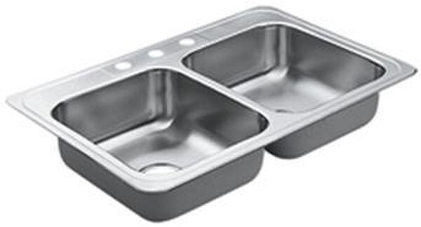 Fregadero Doble para Cocina, . Fregadero doble formado de acero inoxidable calibre 20 niquelado, con dimensiones: 33" L x 22" W x 8" D, esquinas redondeadas, de 3 orificios y desagüe de 3-1/2” de diámetro. Ambos recipientes son iguales.