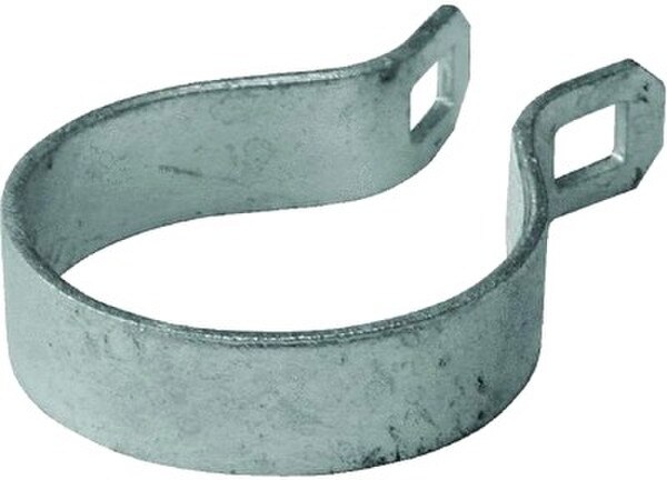 Abrazadera de Terminal sin Tornillo. Abrazadera de hierro galvanizado para usar conjuntamente con un terminal de tubo para fijar el tobo superior al poste terminal. El tornillo de carruaje se vende por separado.