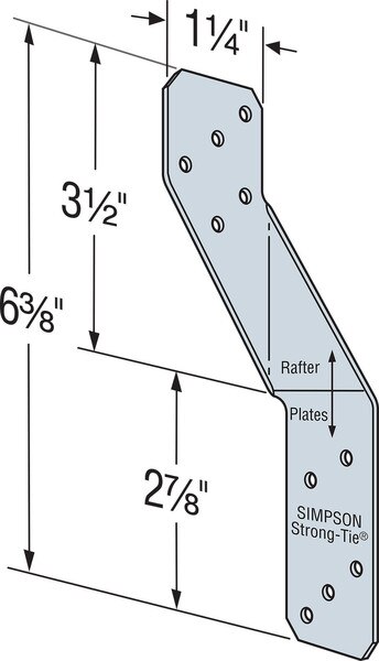 Anclaje H2.5T para Huracán Calibre 18 de 6-3/8” x 1-1/4", Simpson Strong-Tie. Anclaje anti-huracán para la construcción en madera, hecho de acero de calibre 18 con tratamiento anticorrosión G90 estándar, (galvanizado de zinc que contiene 0.90 onzas de zinc por pie cuadrado de superficie). Dimensiones: 6-3/8” x 1-1/4", proporciona una conexión positiva entre la viga y la pared de la estructura para resistir el viento y las fuerzas sísmicas.