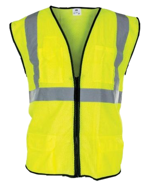 Class 2 Surveyor’s Vest 100% polyester mesh, 2″ reflective tape, Front zipper closure, Pockets: 2 front chest, 2 hip