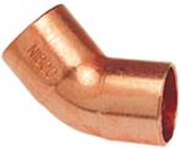 Curva de Cobre de 45° C x C, 606, Nibco®. Curva de cobre de 45° sin plomo para soldar, se utiliza en sistemas residenciales y comerciales tales como agua potable, aire acondicionado y refrigeración. Curva de cobre de 45° con extremos para soldadura, permite cambiar la dirección de la tubería de línea en un ángulo de 45 grados.