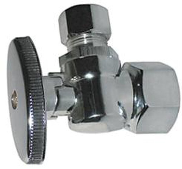 Llave de Paso Angular de 1/4 de Vuelta, 1/2" x 3/8", Kissler. Llave de paso angular construida en latón con acabado en cromo y conexión de entrada de rosca hembra de 1/2" y conexión de salida de 3/8" diámetro externo de compresión, 1/4 de vuelta para abrir y cerrar el paso de agua.