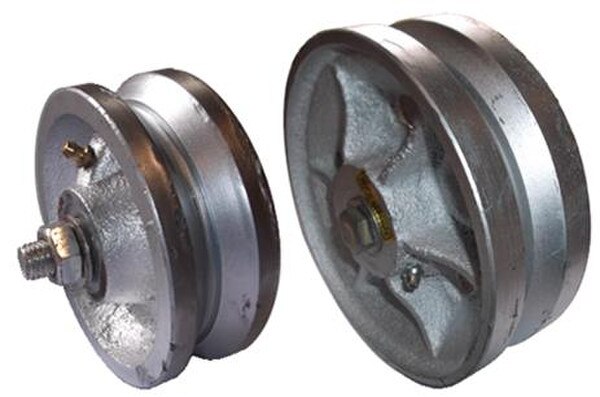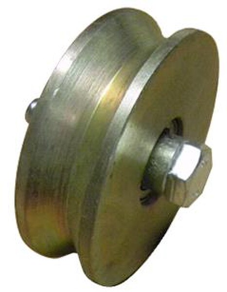 Rueda Angular de 4" en Acero con Caja de Bola Sellada y Tornillo. Rueda angular (de ranura en V) de acero galvanizado con caja de bola sellada, tornillo y tuerca, para portón corredizo. Disponible en tamaño de 4" de diámetro.