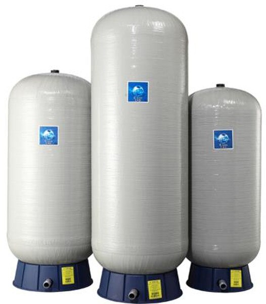 Tanque de Presión de Fiberglass. Serie C2Lite CAD ™, única construcción de 3 piezas. Filamento continuo resistente sellado con conexión de plástico reforzado, resistente base de polipropileno y válvula de aire en latón de calidad.